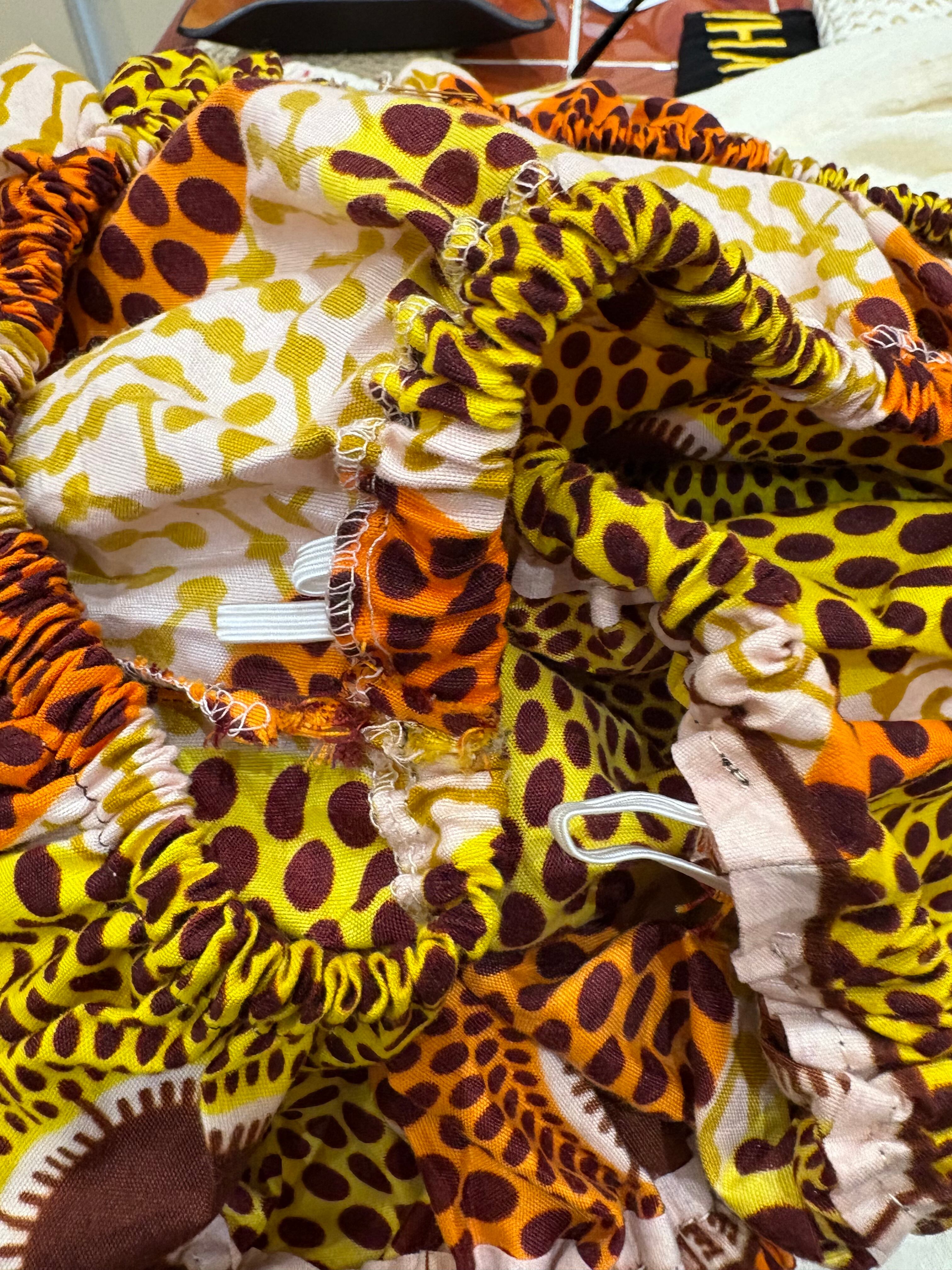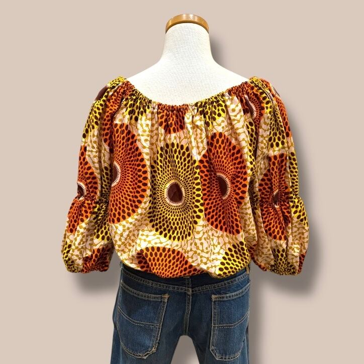 アフリカンバティックの生地を贅沢に使ったブラウスです。肩、ウエストとゴムでゴム入れ口より調整出来ます。