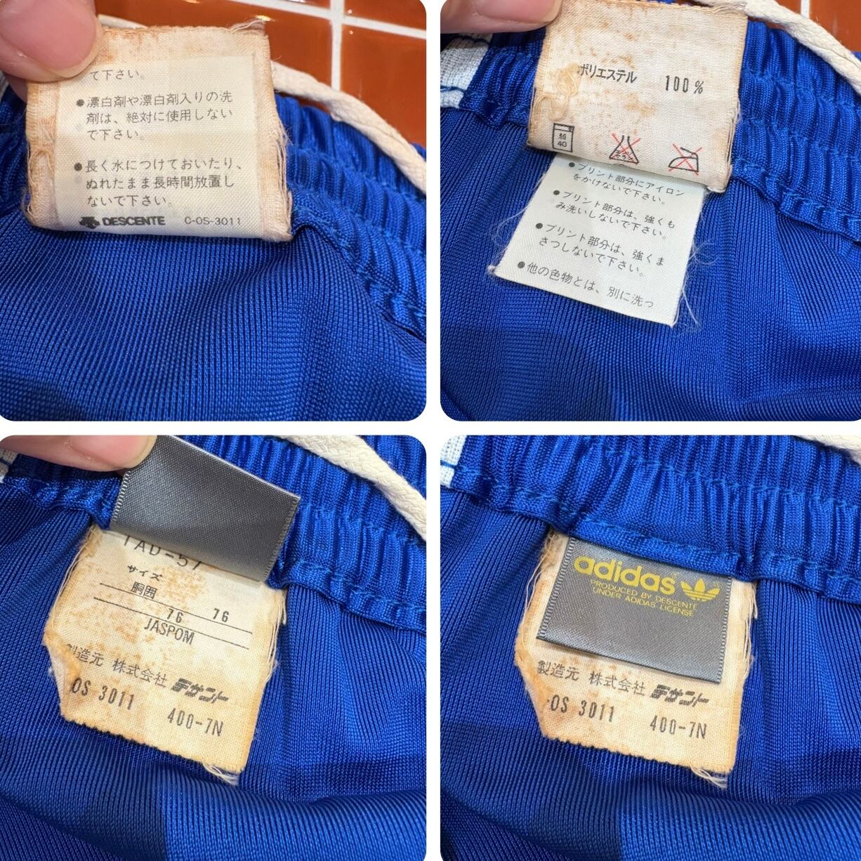 adidasのロゴが薄くなっていたり、ウエスト紐やタグに経年による変色が見られます。