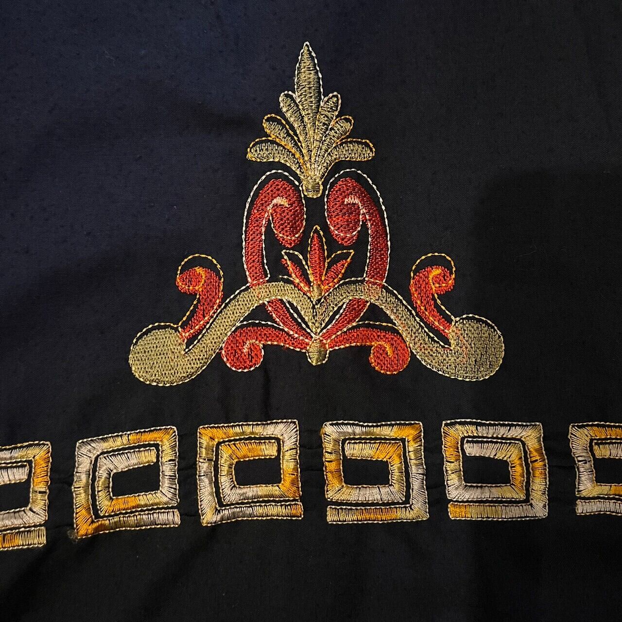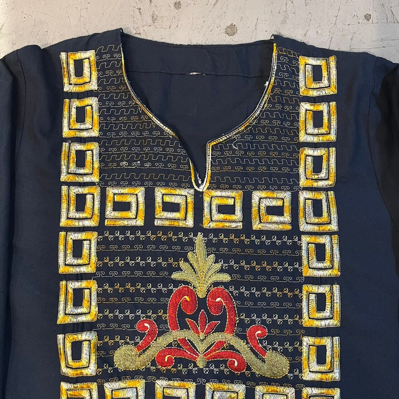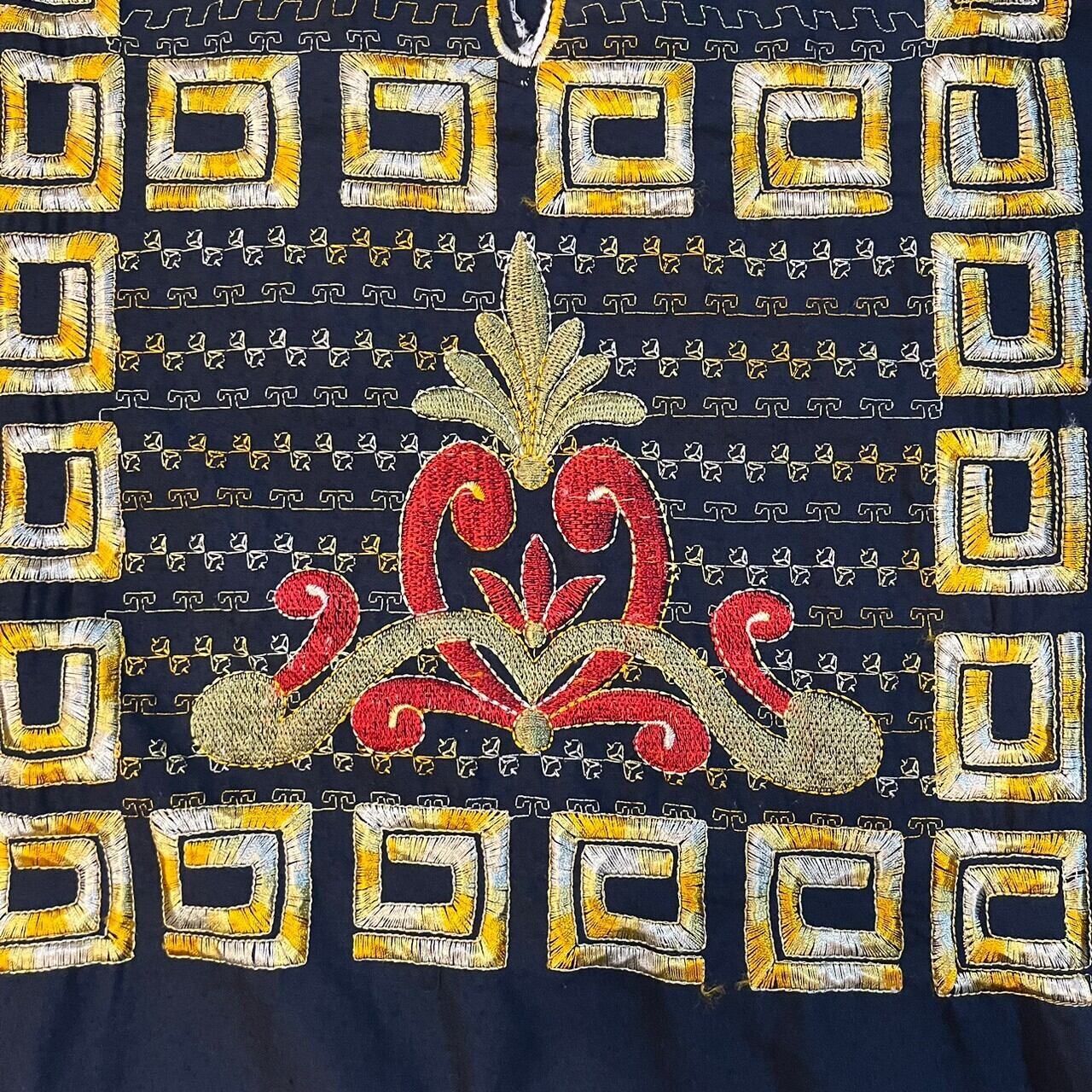 フロントと裾に民族的な刺繍が施されたロングワンピースです。お色は濃いネイビーです。