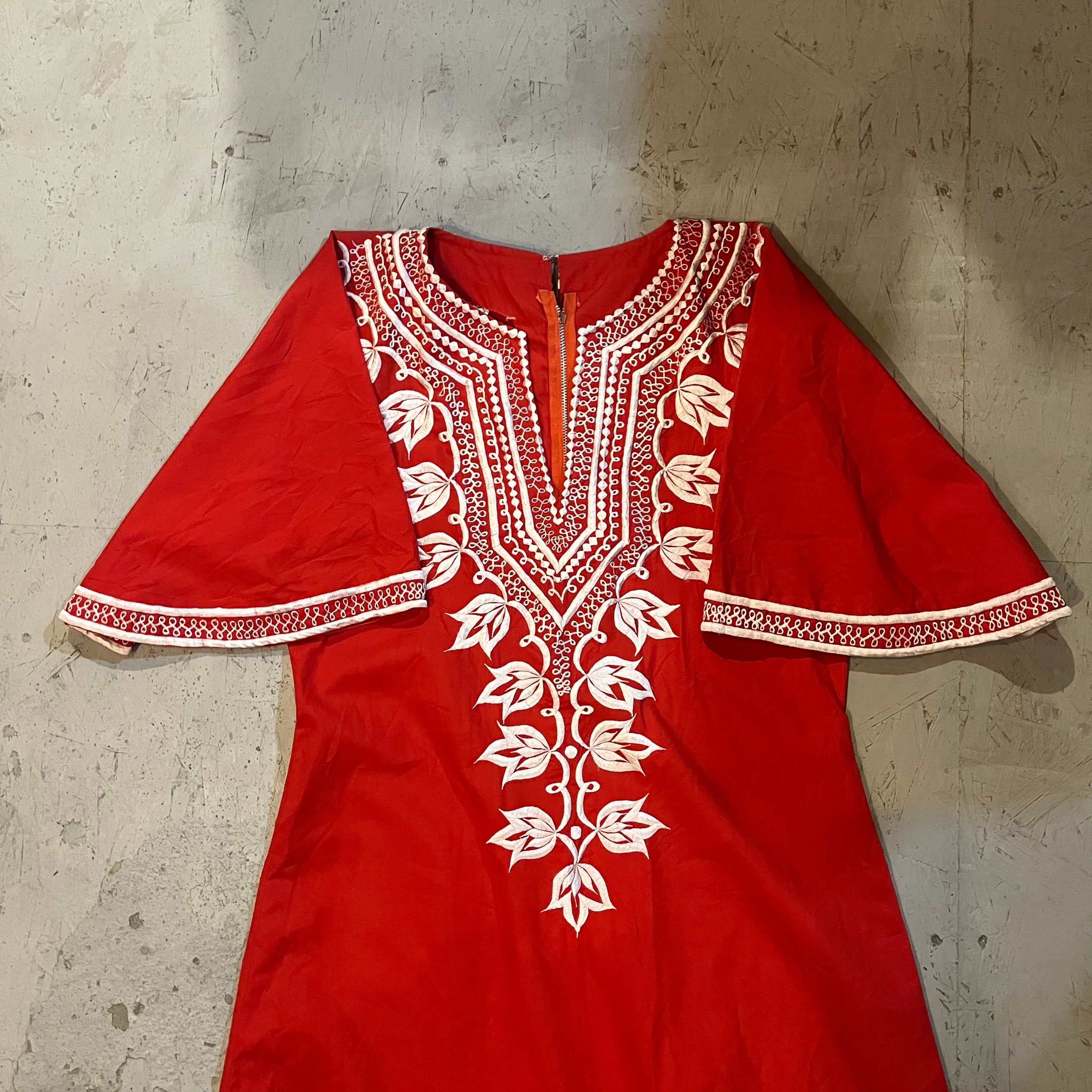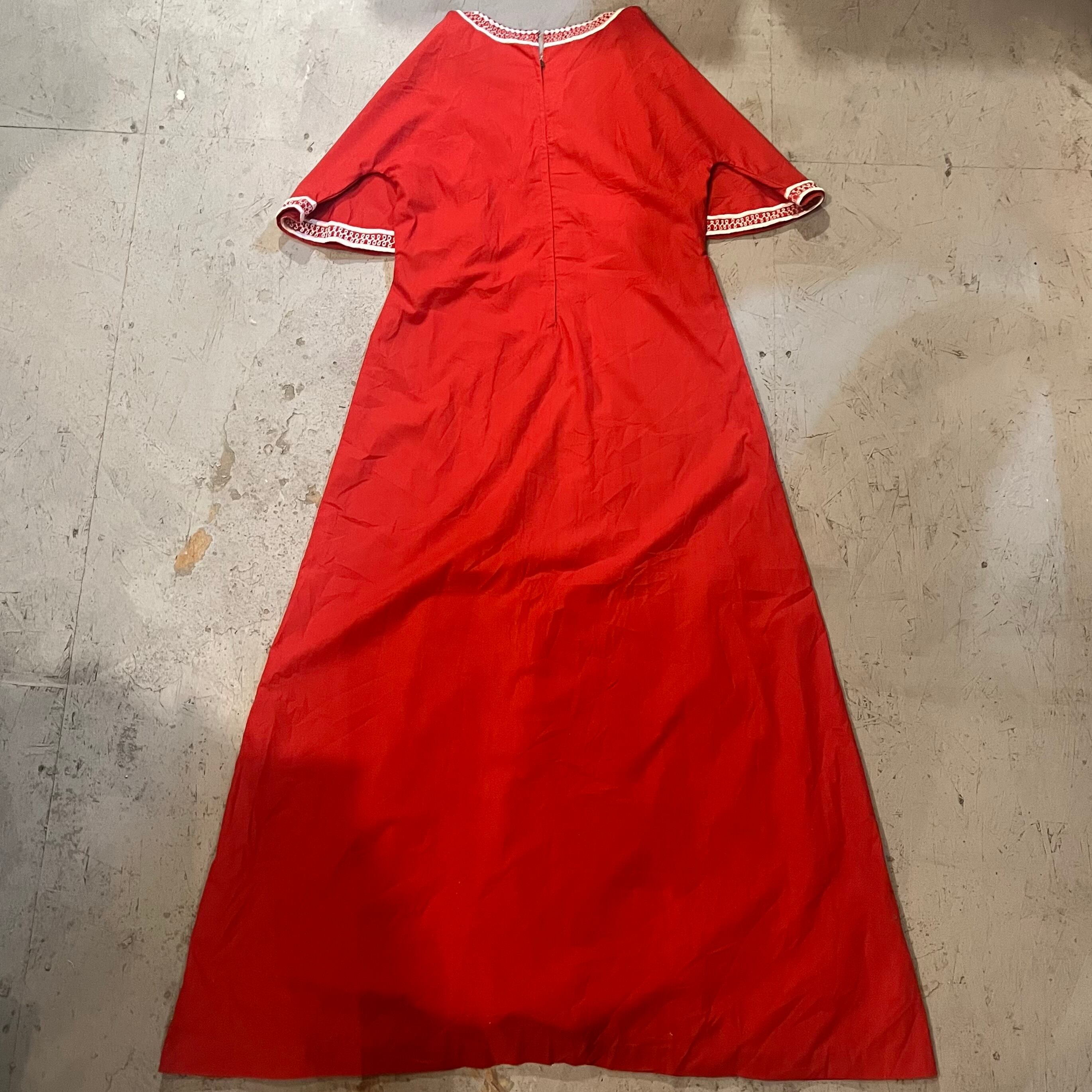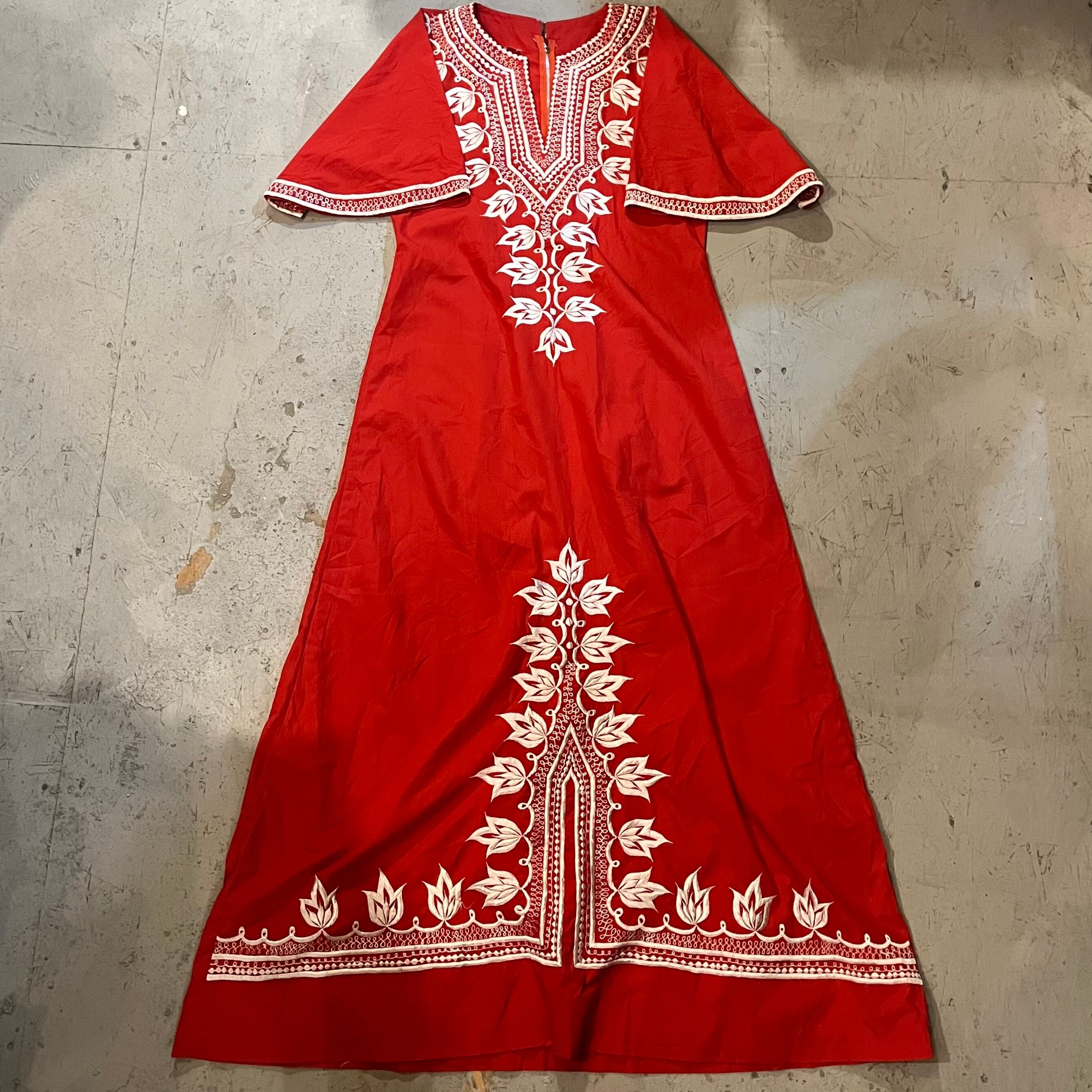 胸元と裾にホワイトカラーの刺繍が施されたロングワンピースです。Aラインのシルエットと袖口が広がったシルエットが特徴的なワンピースです。