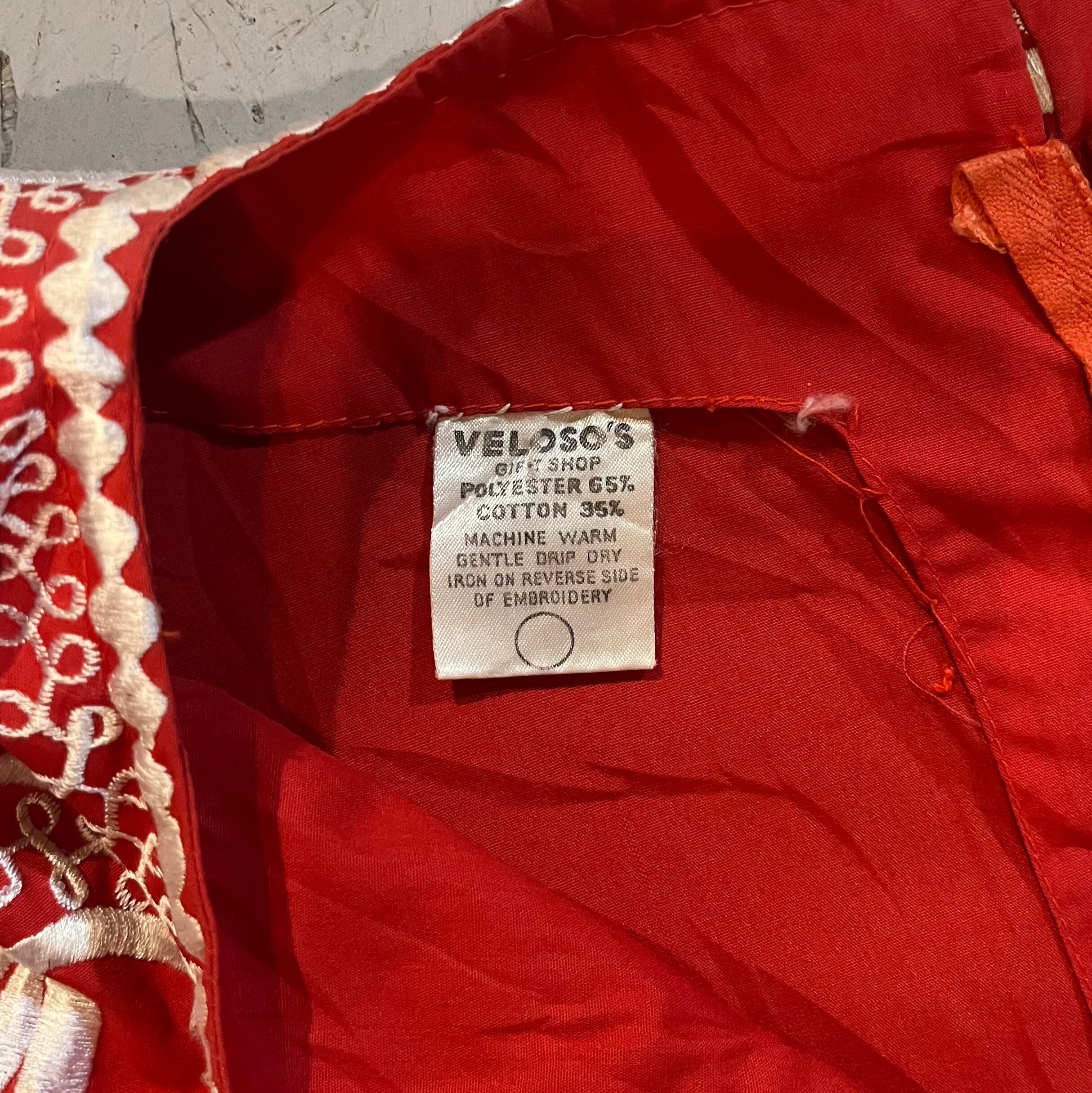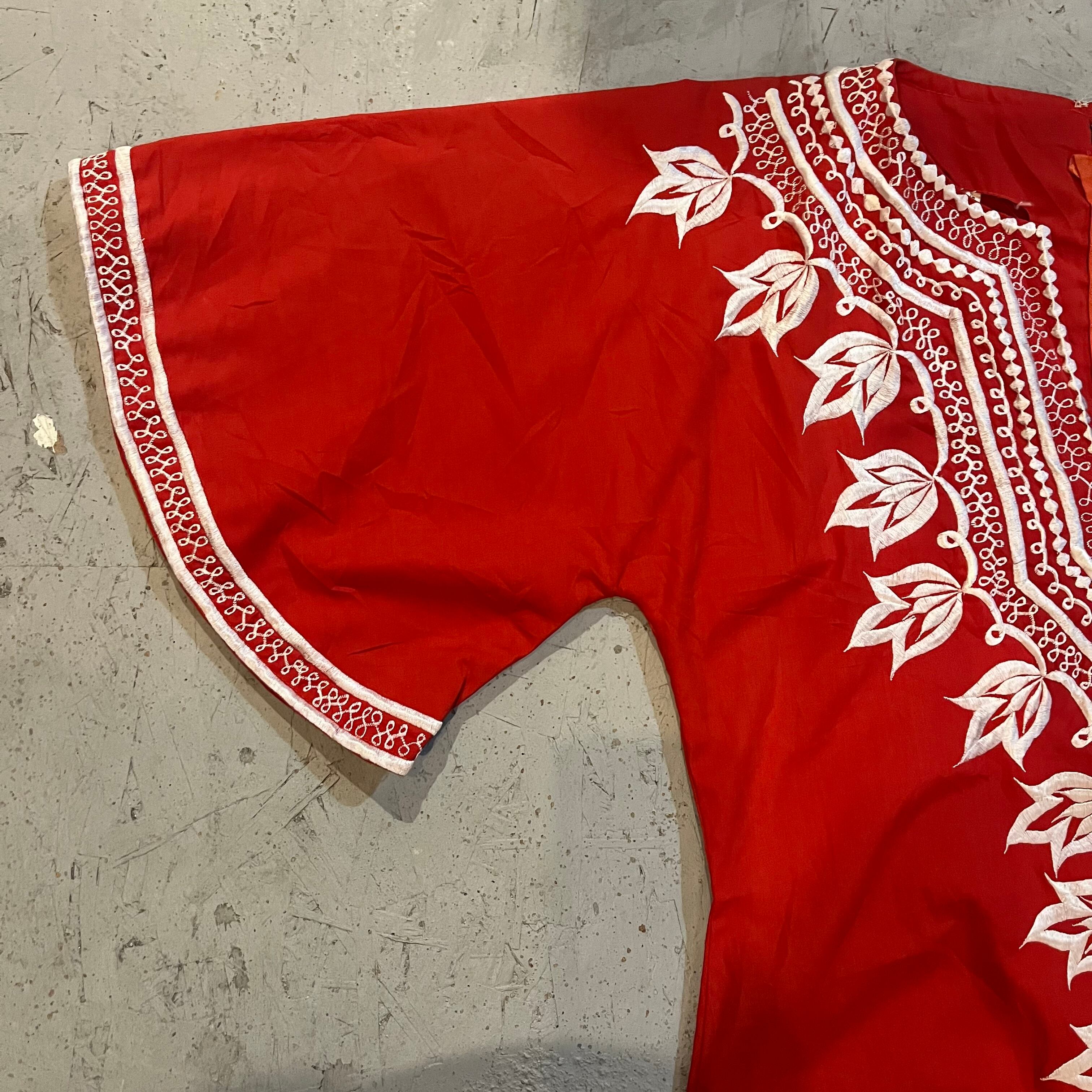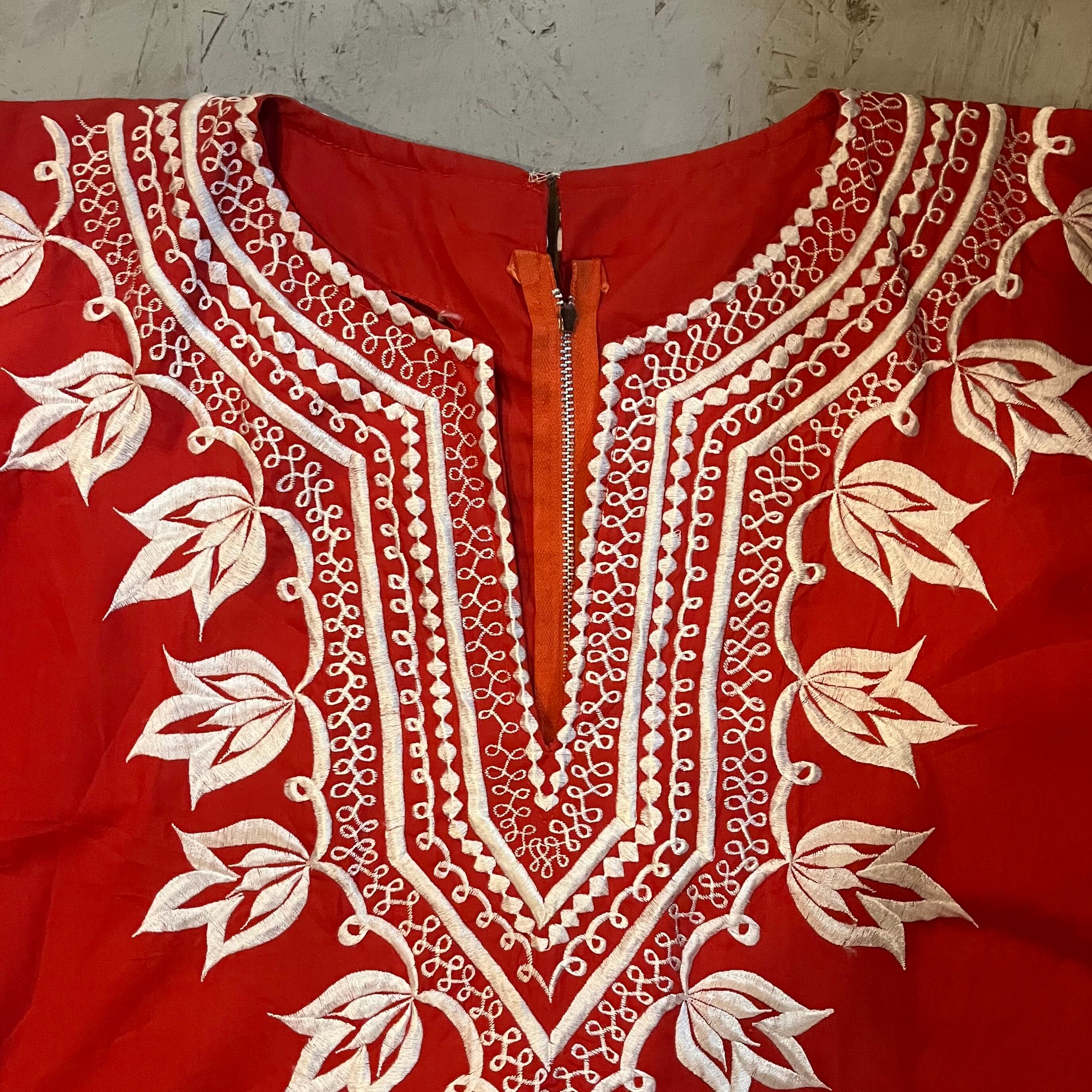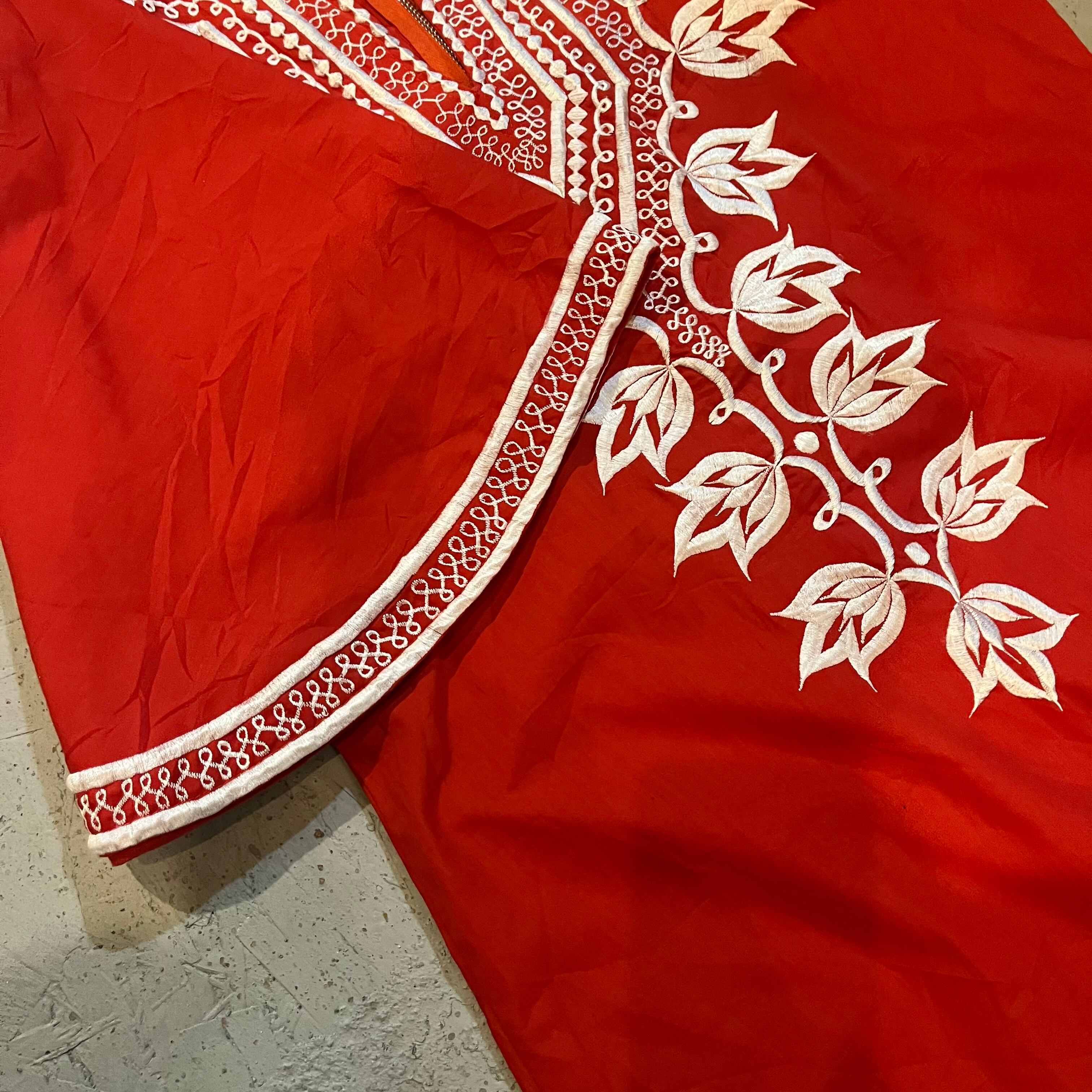 胸元と裾にホワイトカラーの刺繍が施されたロングワンピースです。Aラインのシルエットと袖口が広がったシルエットが特徴的なワンピースです。